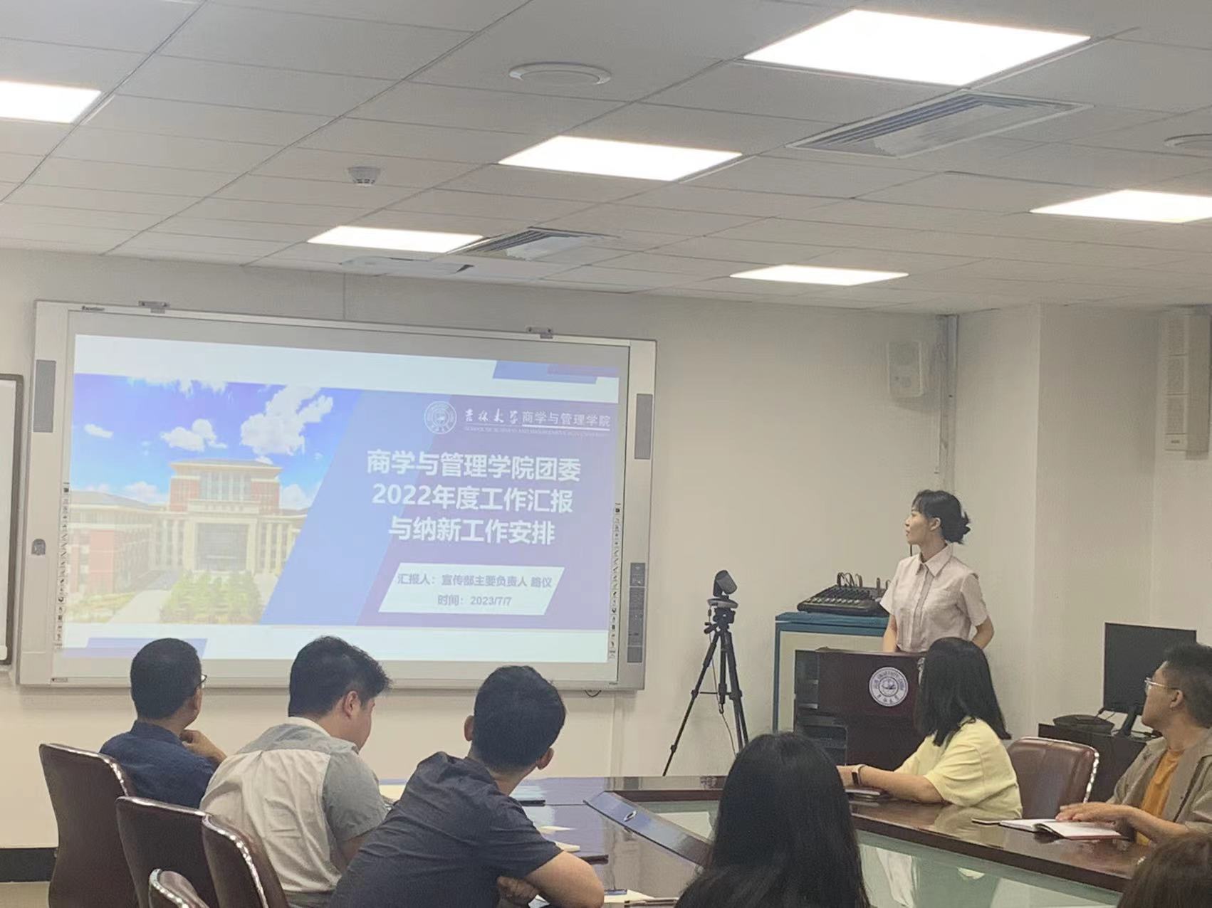 团委宣传部主要负责人路仪对2022-2023年度团委工作进行汇报,总结了团委一年来围绕党的二十大精神、校企合作、科研就业、心理建设等各方面展开的相关活动,并对2023年秋季学期纳新工作具体流程和准备工作进行安排。而后,院研究生会高永潇分享了2023级新生迎新策划创意创新方案,团委委员张庭赫就换届、纳新和迎新工作发表了自己的独特见解。
