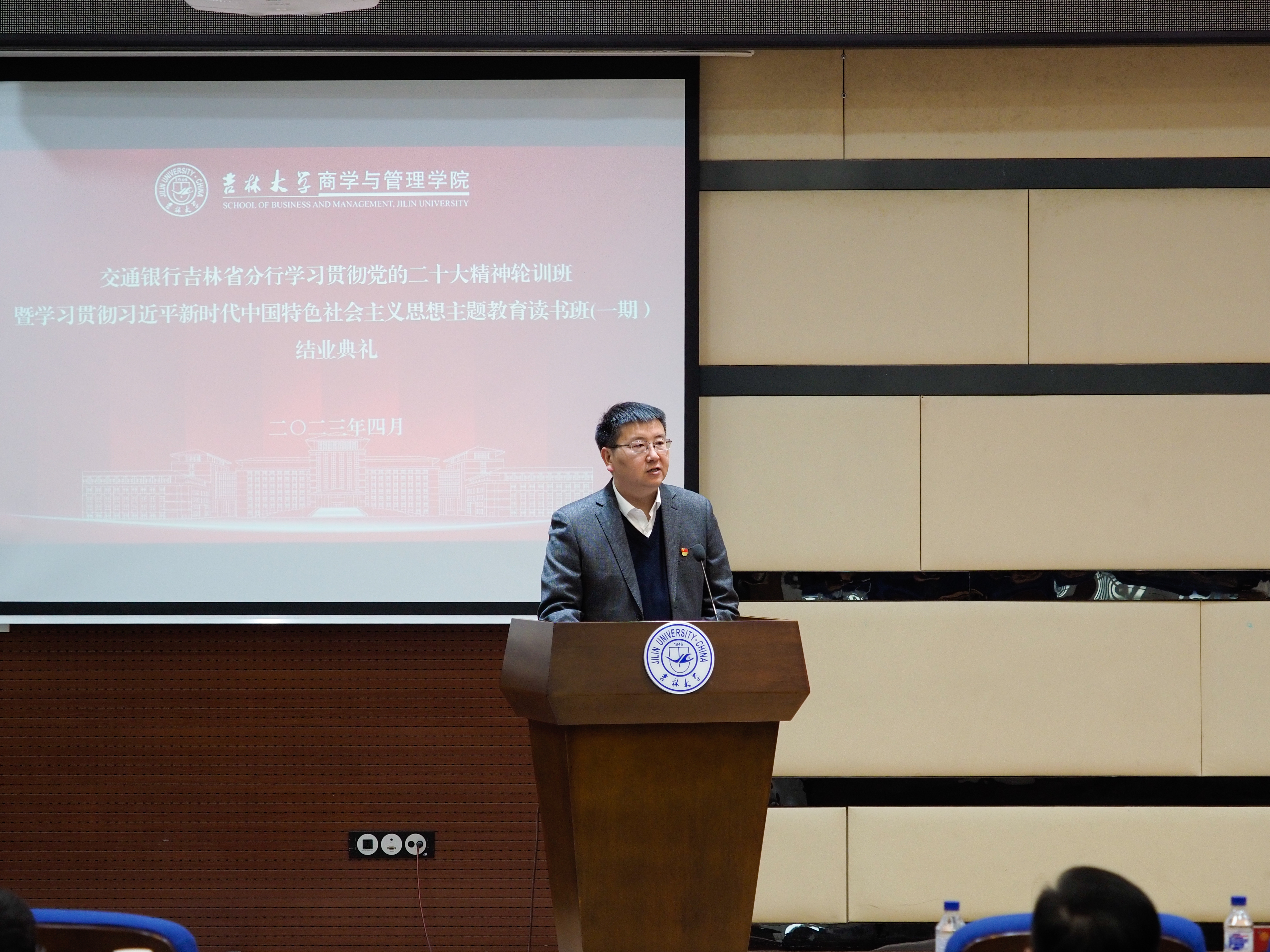 23日下午,交通银行吉林省分行学习贯彻党的二十大精神轮训班暨学习贯彻习近平新时代中国特色社会主义思想主题教育读书班结业仪式在东荣大厦B310隆重举行。交通银行吉林省分行党委书记、行长张国昌,党委委员、副行长宋卫、沈涛,商管学院副院长辛本禄教授参加了结业式。党委常委、副校长、商管学院院长蔡立东教授和院党委书记赵军教授参加了结业式前的会谈。