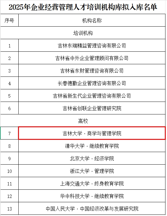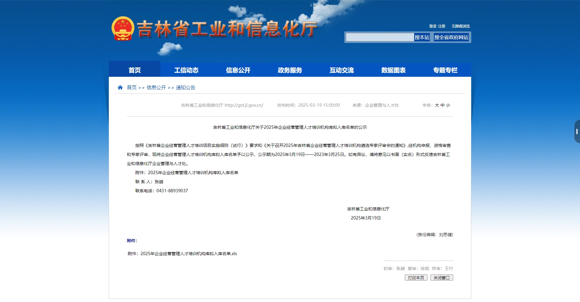 近日,吉林省工业和信息化厅发布了2025年企业经营管理人才培训机构库拟入库名单,探花 凭借雄厚的师资力量、丰富的教学资源和卓越的培训成果,成功入选。